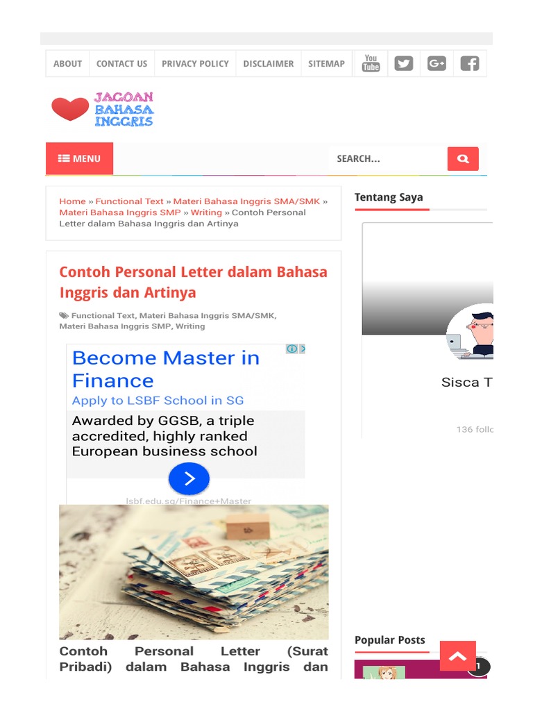 Sekarang anda tak perlu lagi khawatir jika harus menulis surat lamaran kerja berbahasa inggris. Bahasa perbedaan antara surat resmi dan surat pribadi yang terakhir adalah bahasa yang digunakan. Okee tanpa basa basi lagi mari kita langsung saja simak contoh surat pribadi dalam bahasa inggris beserta terjemahannya berikut ini. Hello everyone, meet again with us here in our beloved website! Pengertian, komponen dan contoh complex noun phrase.